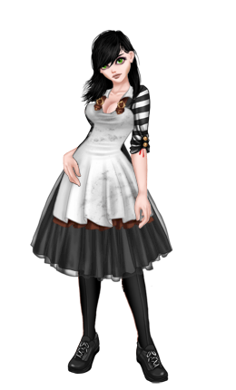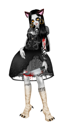 Pierwszym strojem, który wybrałam jest Cheshire cat, cała skóra jest w odcieniu szarości i jest pokryta różnorodnymi wzorami, plamami krwi i ranami, z których sączy się krew, twarz z dość wrogo nastawioną miną i dużymi, świecącymi ślepiami, a w okół nich ostry i rozmazany czarny tusz, widnieje na niej również czarny tatuaż, który trochę przypomina błyskawicę, z głowy wyrastają jej naturalnie czarne włosy, sięgające do pasa, a na czubku głowy para kocich uszu. Jej ogólny strój to poniszczona szaro-czarna suknia, u góry twardy gorset chroniący przed atakami z zawiłymi wzorami na żebrach, rękawy przypominające bufki również są twarde i pokryte wzorami, trochę niżej zniszczona spódnica przez podarte warstwy materiału widać jej stelaż jak i trochę zakrwawień. Na jednej dłoni ma wyrobione z metalu pazury, które są jeszcze we krwi po ostatniej walce, w tej samej dłoni trzyma również zakrwawiony nóż, z którym nigdy się nie rozstaje i zawsze towarzyszy jej podczas bitew, na jej nogach widnieją kocie łapy z kremowym futrem, które nie zdążyło jeszcze dobrze pochłonąć brudu z otaczającego je okropnego świata.