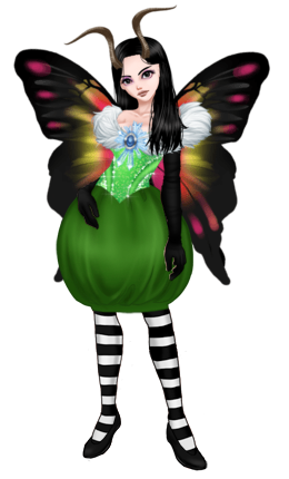 Drugim strojem jest Caterpillar, w tym stroju skóra jest w zwykłym kremowym odcieniu, jej mina jest dość neutralna, średnie oczy, w których widnieją nietypowe czarne tęczówki, dookoła nich ma delikatnie pomalowane oczy na kolor fioletowy, włosy są w jednym i zawsze tym samym odcieniu czyli czarnym. Jeżeli chodzi o strój to zacznijmy od głowy, na niej widniały niegdyś piękne zielono-niebieskie czułki niestety z czasem i brakiem pielęgnacji zmieniły się w twarde, oszpecające rogi, suknia stworzona jest na wzór kokonu, w którym poczwarki przeobrażają się w motyle, góra tej sukni zawsze się świeci przez śluz jaki wytwarza kokon, przy gorsecie widnieje jeszcze biały futrzany szal, na jej plecach rosną ładne, kolorowe motyle skrzydła, ale ich w żaden sposób nie używa. Na prawie całych rękach założone ma czarne, gumowe rękawiczki, ostatnim elementem stroju są rajstopy w biało-czarne paski, które zakończone są bardzo twardymi "butami", czymś w stylu kopyt.